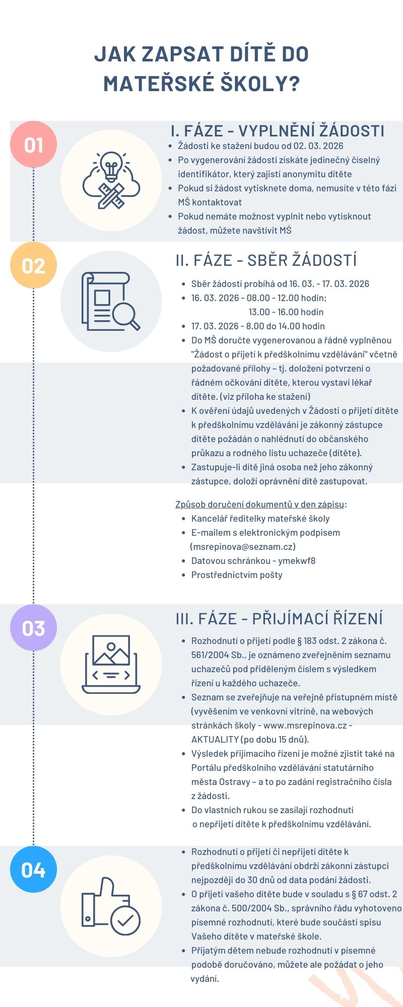 Informace o pořadí vaší žádosti a dalších krocích vedoucích k přijetí dítěte do mateřské školy se dozvíte opět na webu elektronického zápisu. Dále bude dle zákona 500/2004 Sb. zveřejněn seznam přijatých dětí v zákonné lhůtě na webových stránkách školy a ve vitríně visící na plotě mateřské školy. Písemné rozhodnutí o nepřijetí dítěte k předškolnímu vzdělávání si vyzvedne zákonný zástupce osobně a do vlastních rukou v kanceláři ředitelky školy.